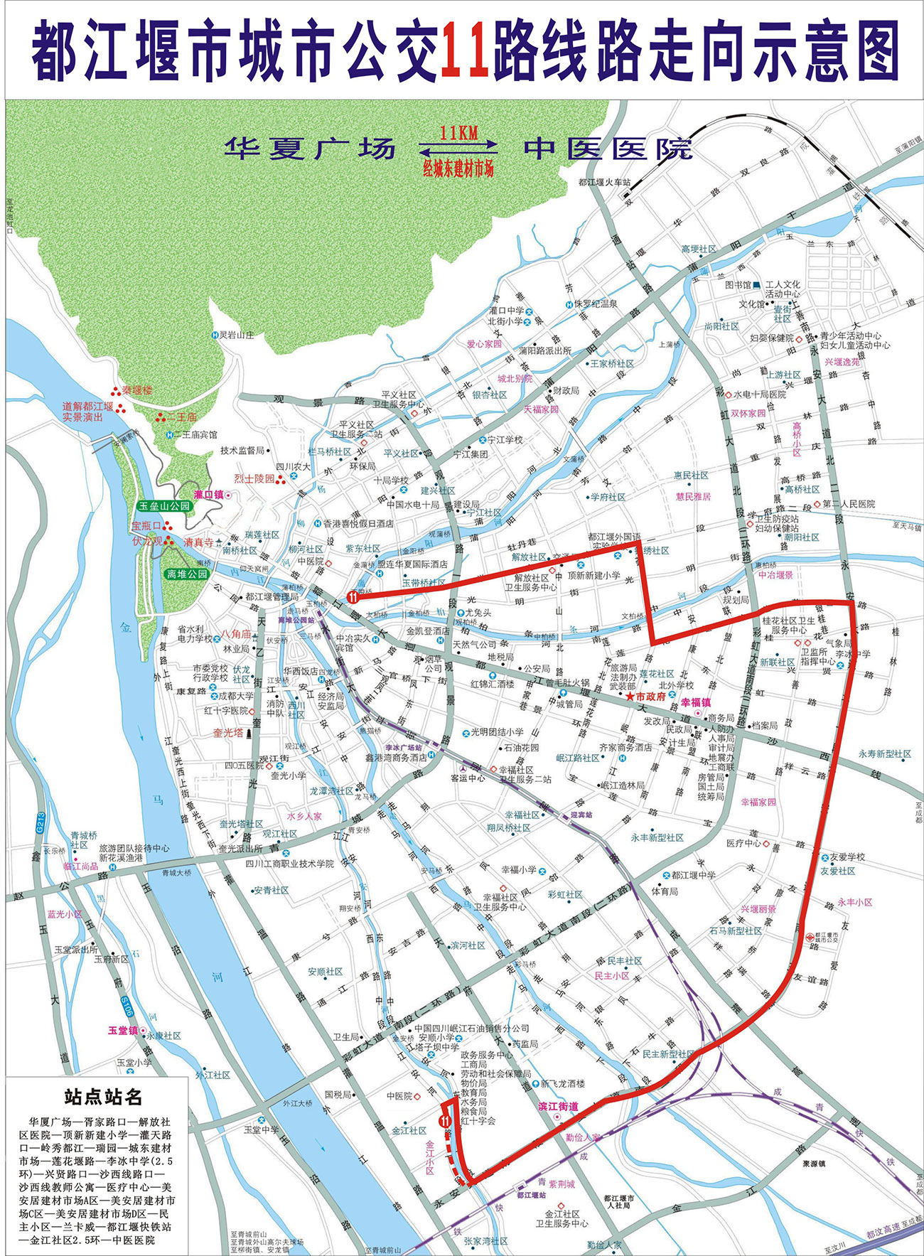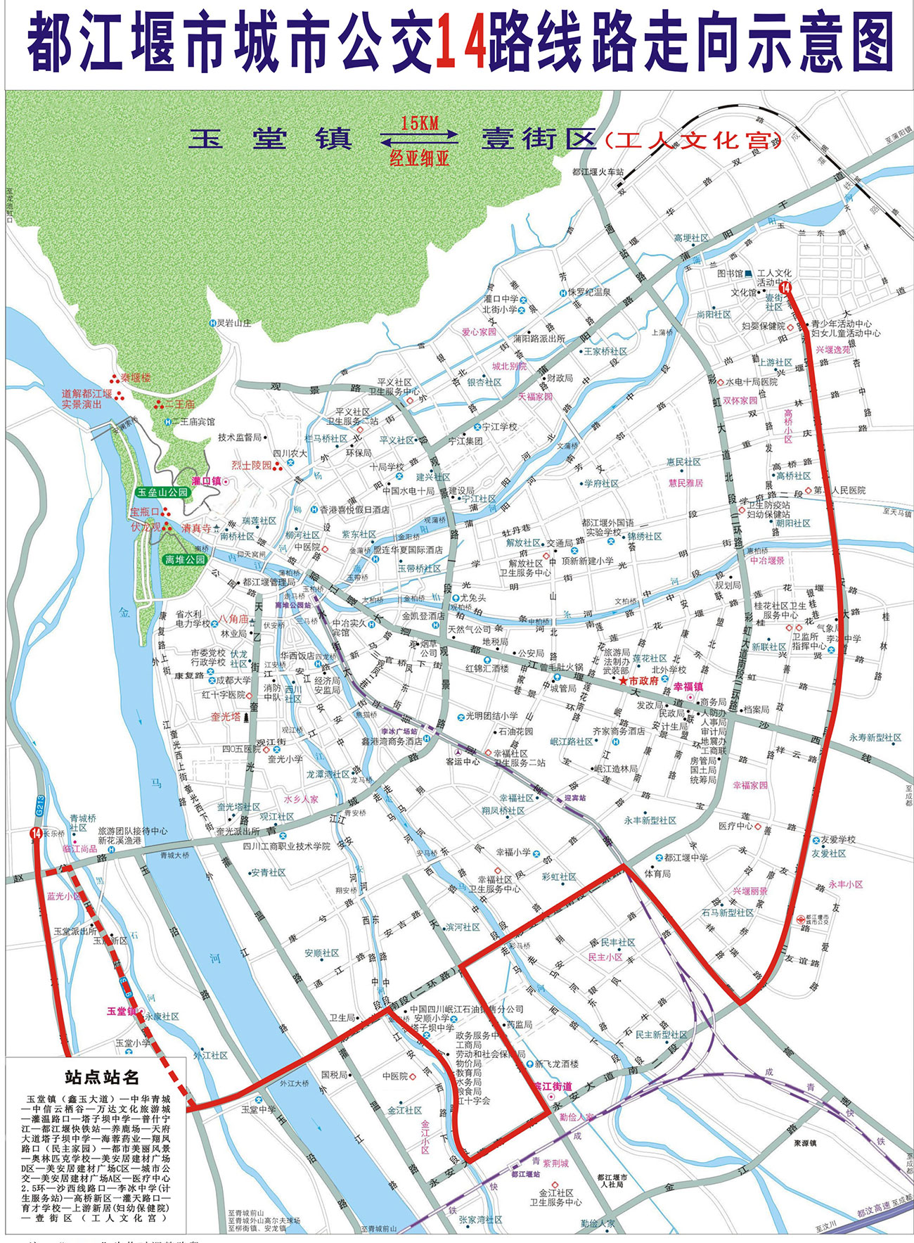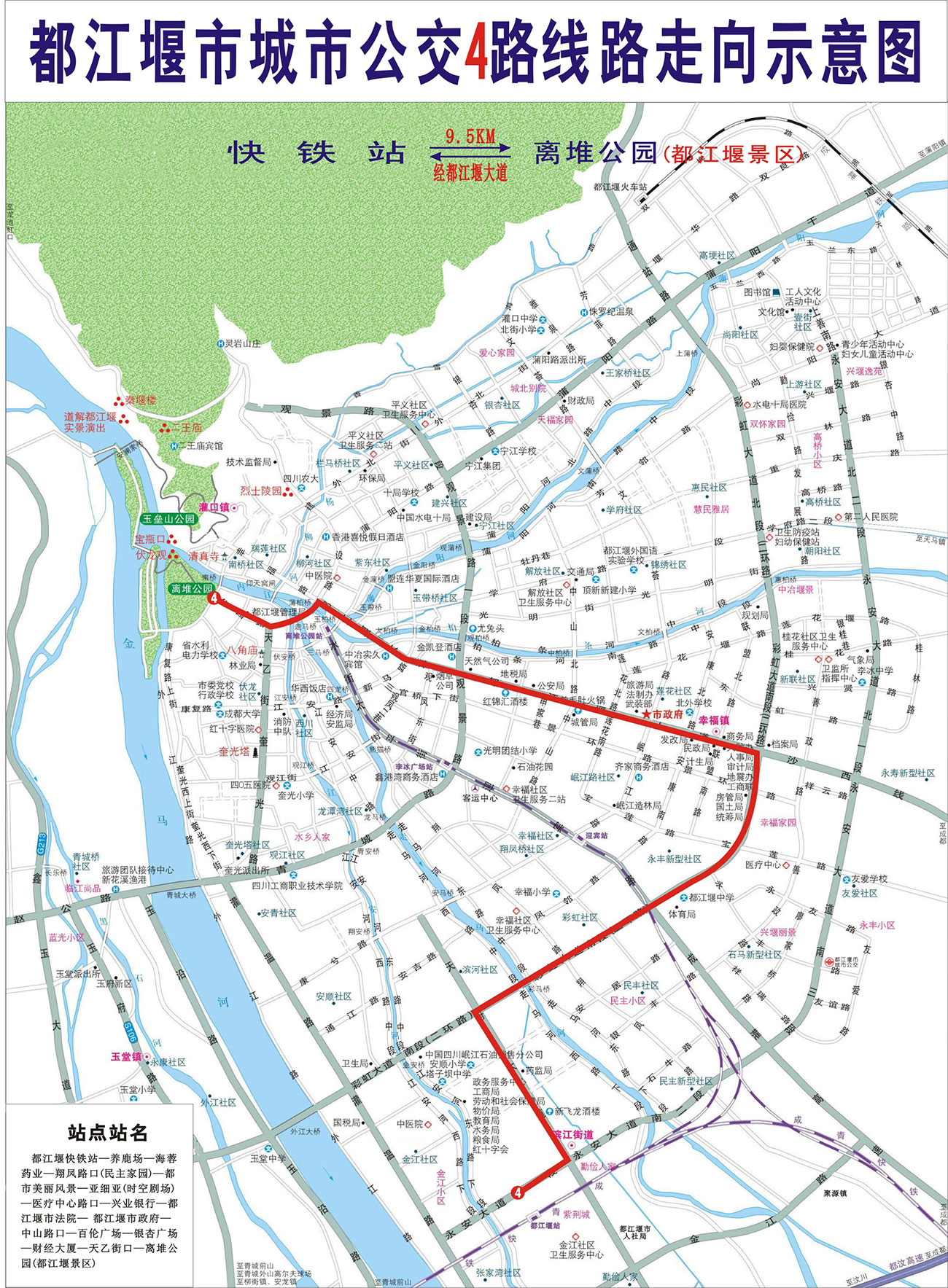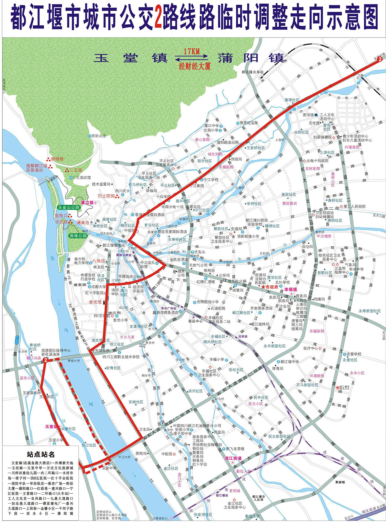 都江堰快鐵站—普什寧江—中醫(yī)院一鈣品公司—青城壹號(hào)橋(二環(huán)路口)一郵政局一內(nèi)二環(huán)路口一木材市場(chǎng)—塔子村一四O五醫(yī)院一紅十字會(huì)醫(yī)院一離堆小區(qū)一天乙街口一蒲陽(yáng)路口一四川農(nóng)業(yè)大學(xué)一玉壘山隧道—香雪海路口—國(guó)宴賓館—古堰春曉—愛(ài)心家園(北街小學(xué))—芳菲路口(侏羅紀(jì)公園)