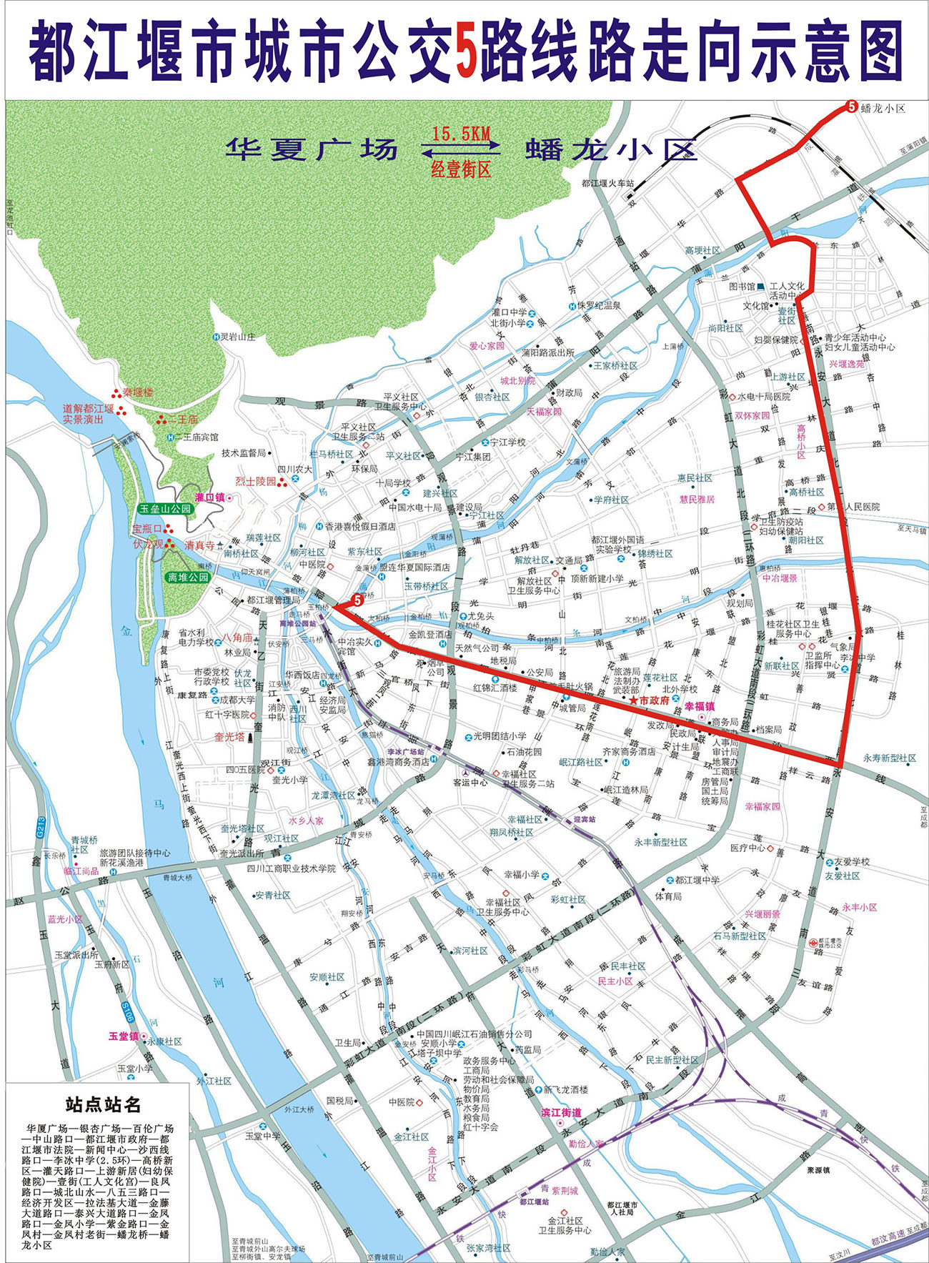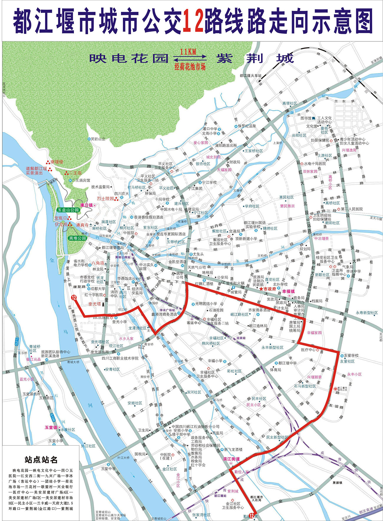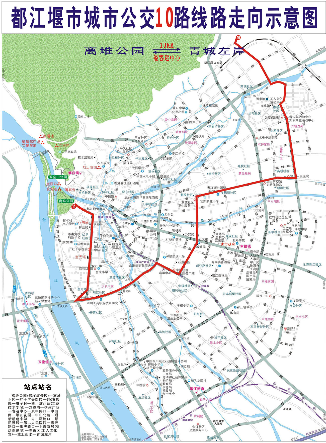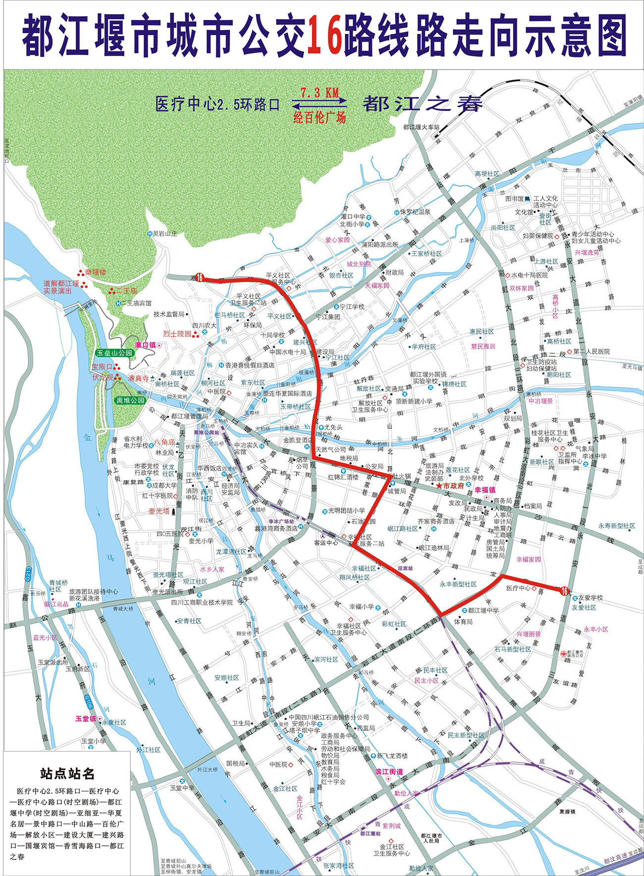 都江堰快鐵站—普什寧江—中醫(yī)院一鈣品公司—青城壹號(hào)橋(二環(huán)路口)一郵政局一內(nèi)二環(huán)路口一木材市場(chǎng)—塔子村一四O五醫(yī)院一紅十字會(huì)醫(yī)院一離堆小區(qū)一天乙街口一蒲陽(yáng)路口一四川農(nóng)業(yè)大學(xué)一玉壘山隧道—香雪海路口—國(guó)宴賓館—古堰春曉—愛(ài)心家園(北街小學(xué))—芳菲路口(侏羅紀(jì)公園)