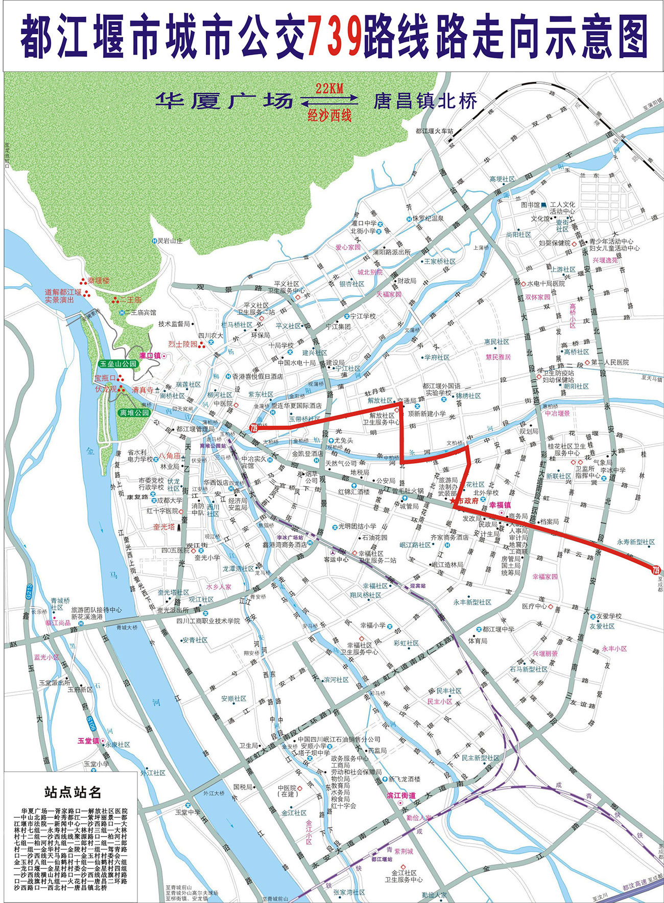 739路:華夏廣場(chǎng)—唐昌鎮(zhèn)北橋(空調(diào)車(chē)) 華夏廣場(chǎng)一胥家路口一解放社區(qū)醫(yī)院一中山北路一嶺秀都江一紫坪麗景一都江堰市法院一新聞中心—沙西線路口—大林村七組—永壽村—大林村三組—大林村十二組—大林村何家院子—沙西線聚源路口—柏河村七組—柏河村九組—二郎村二組—二郎村一組—金華村—金陵村五組—金陵村一組—駕青路口—建華村—沙西線天馬路口—金玉村村委會(huì)—金玉村八組—仙鶴村十組—仙鶴村六組—龍口堰—金星村村委會(huì)—金星村四組—沙西線橫山村路口—沙西線戰(zhàn)旗村路口—戰(zhàn)旗村九組—火花村—唐昌二環(huán)路沙西路口—唐昌鎮(zhèn)北橋